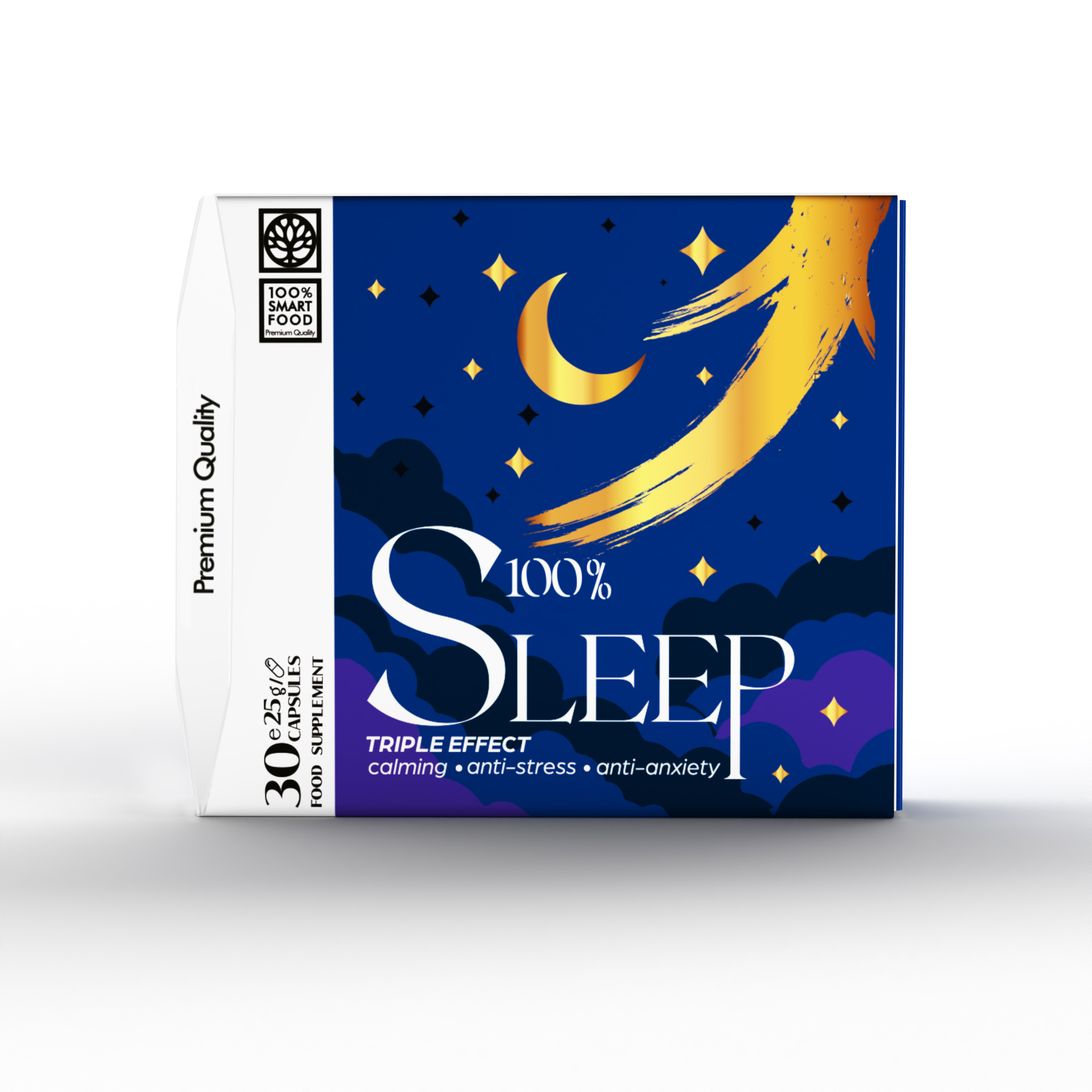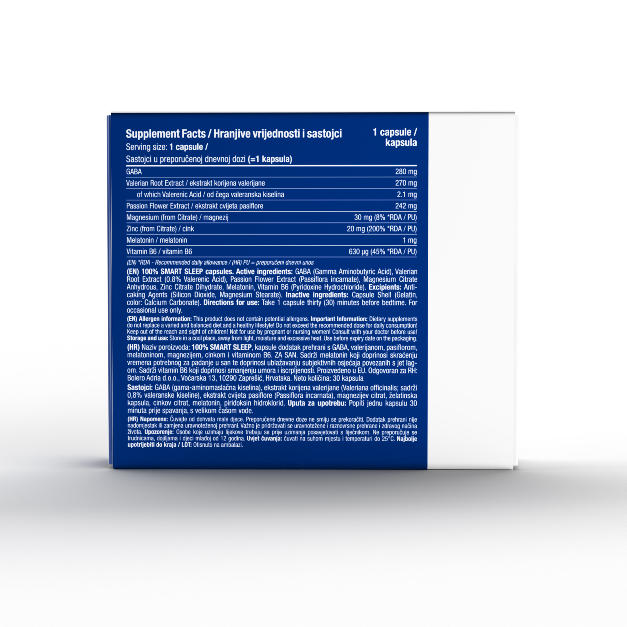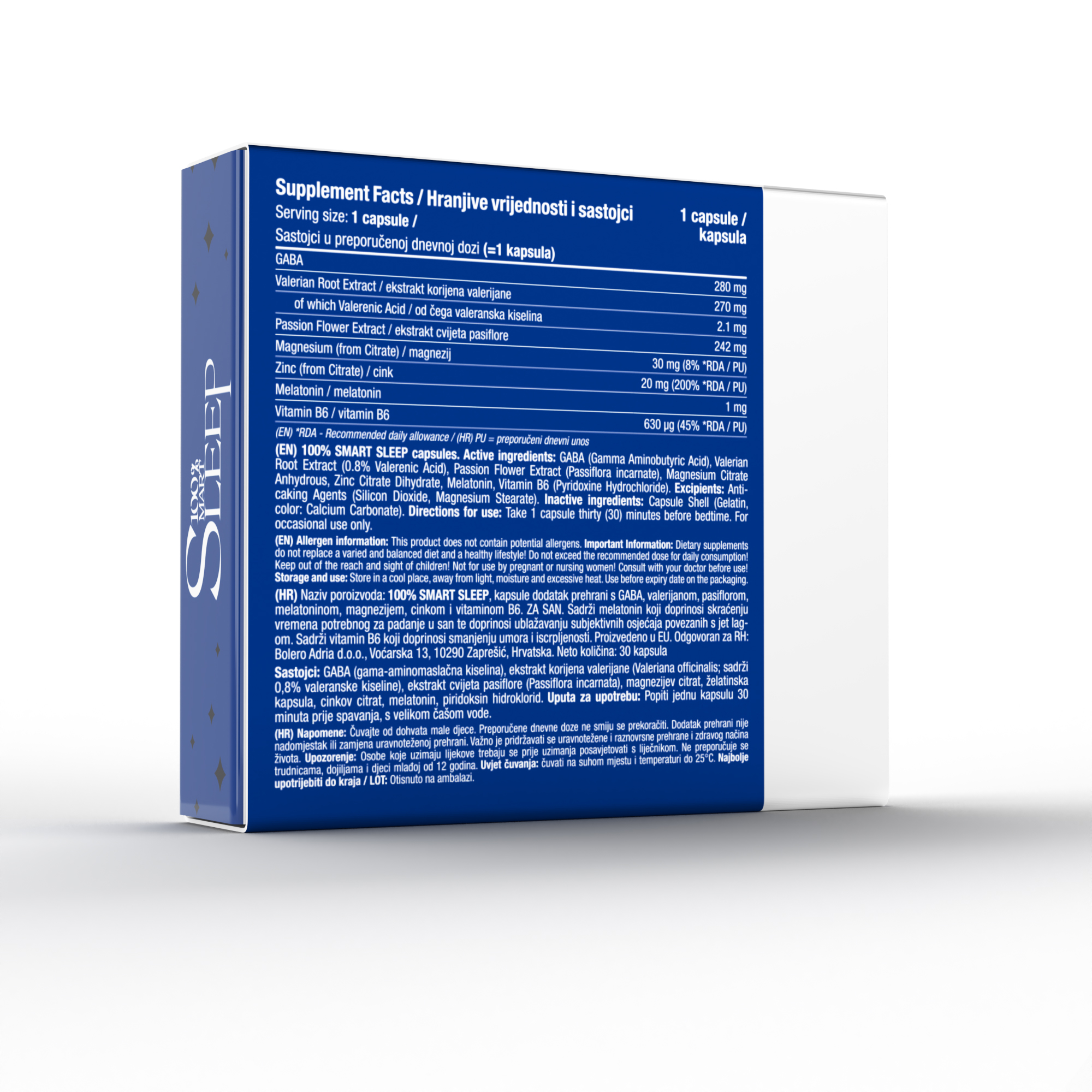 Najbolji pametni sastojci iz prirode, čine 100% Sleep inovativnim rješenjem i proizvodom za napredno poboljšanje kvalitete sna, količine energije i smanjene razine stresa i napetosti. 100% SLEEP, kapsule dodatak prehrani s GABA, valerijanom, pasiflorom, melatoninom, magnezijem, cinkom i vitaminom B6 povoljno utječu na kvalitetu sna, odmor, smirenost, razine stresa i nervoze.